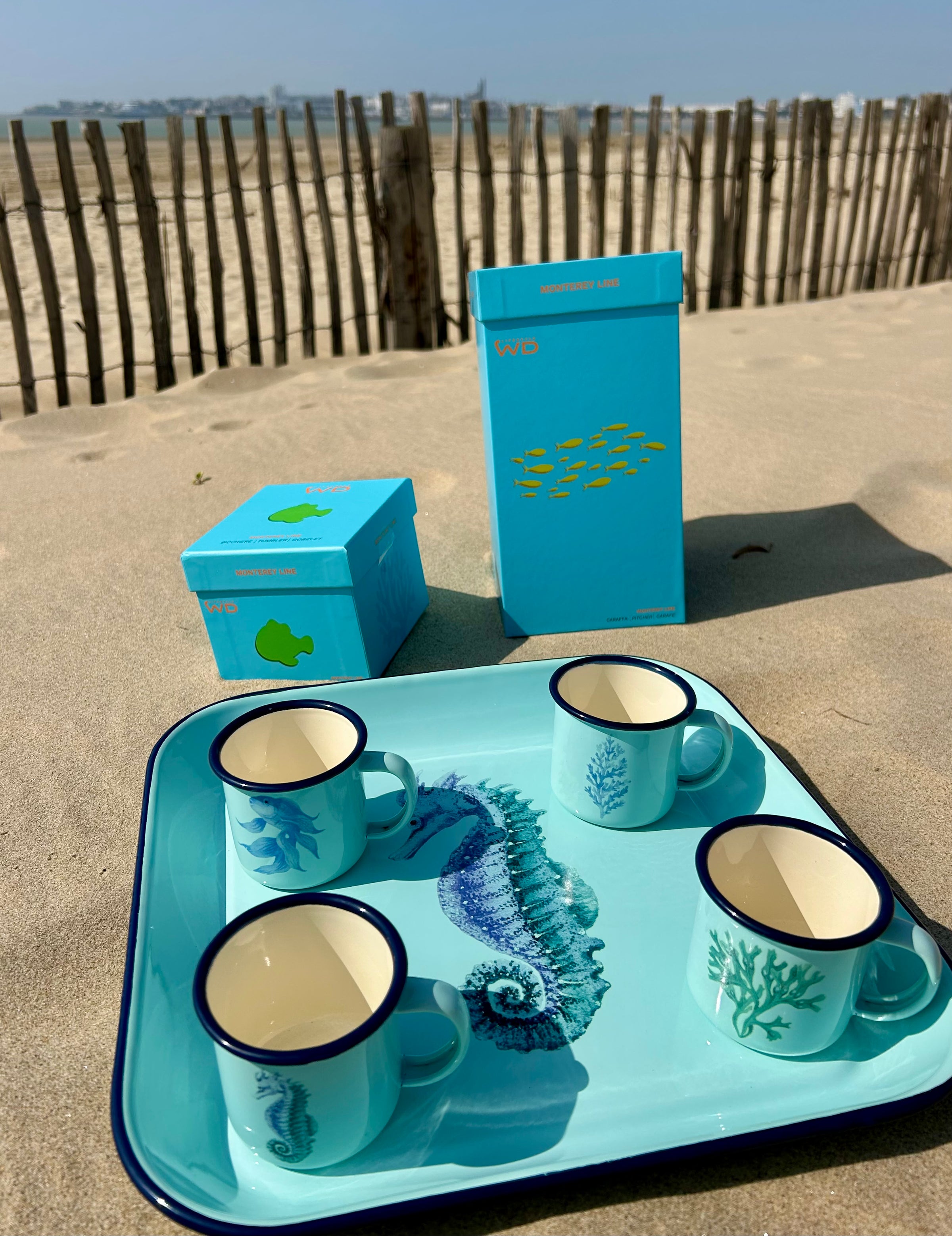 Complétez votre service avec les autres pièces de la collection : pichet assorti, grand plateau rectangulaire décor étoile de mer, tasses à café coordonnées