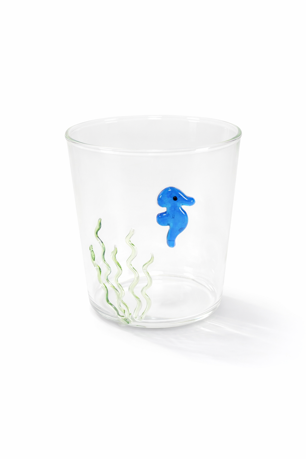Ce verre transparent au design délicat est sublimé par des éléments décoratifs en verre coloré appliqués à l’extérieur : un petit hippocampe. Une pièce unique qui joue sur les détails et la transparence pour créer un effet à la fois léger et sophistiqué.