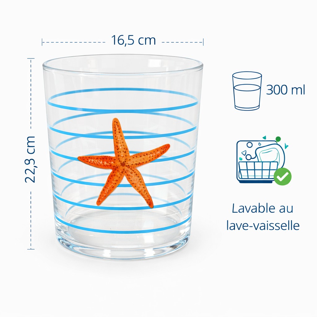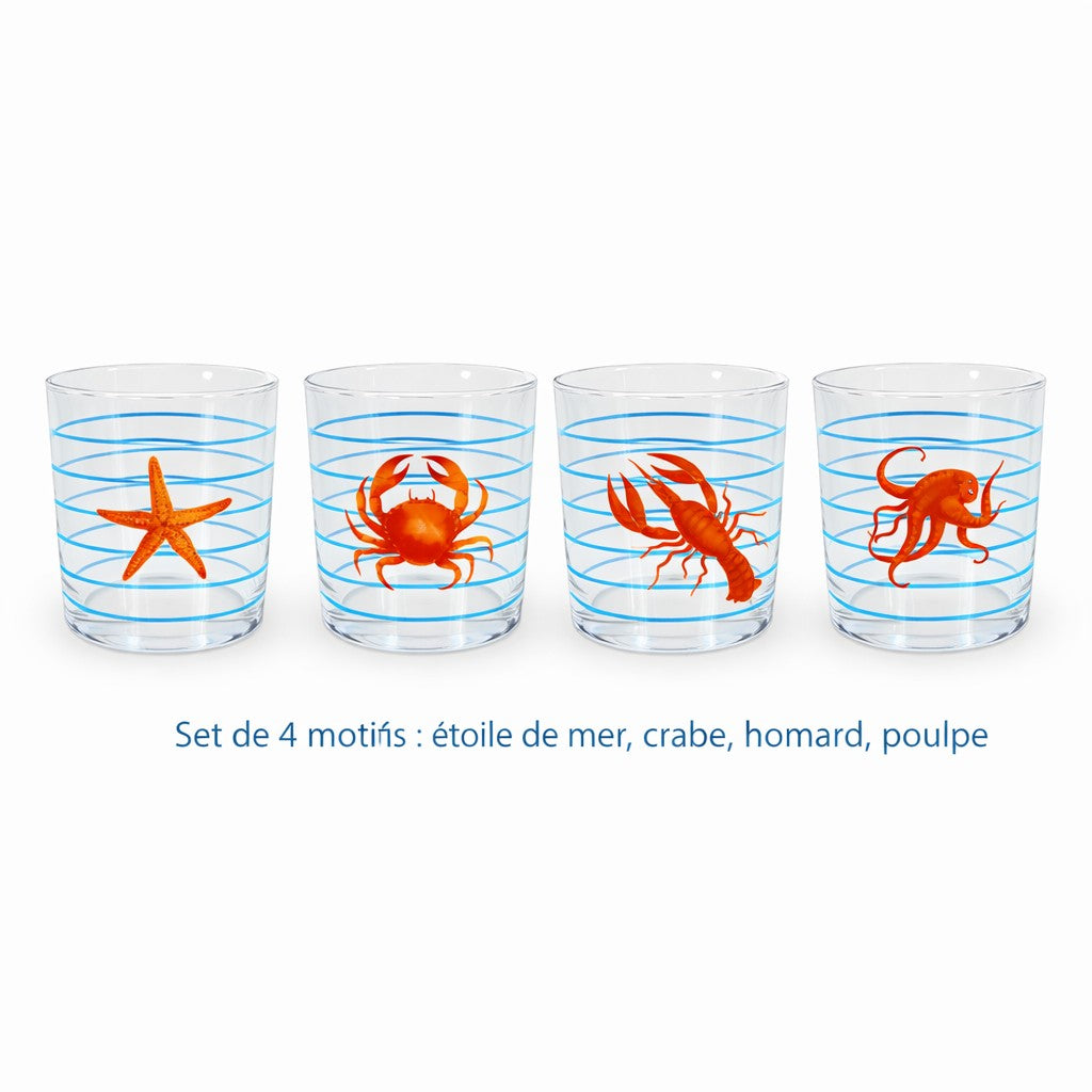 - Composition : lot de 4 verres (1 étoile de mer, 1 crabe, 1 homard, 1 poulpe)