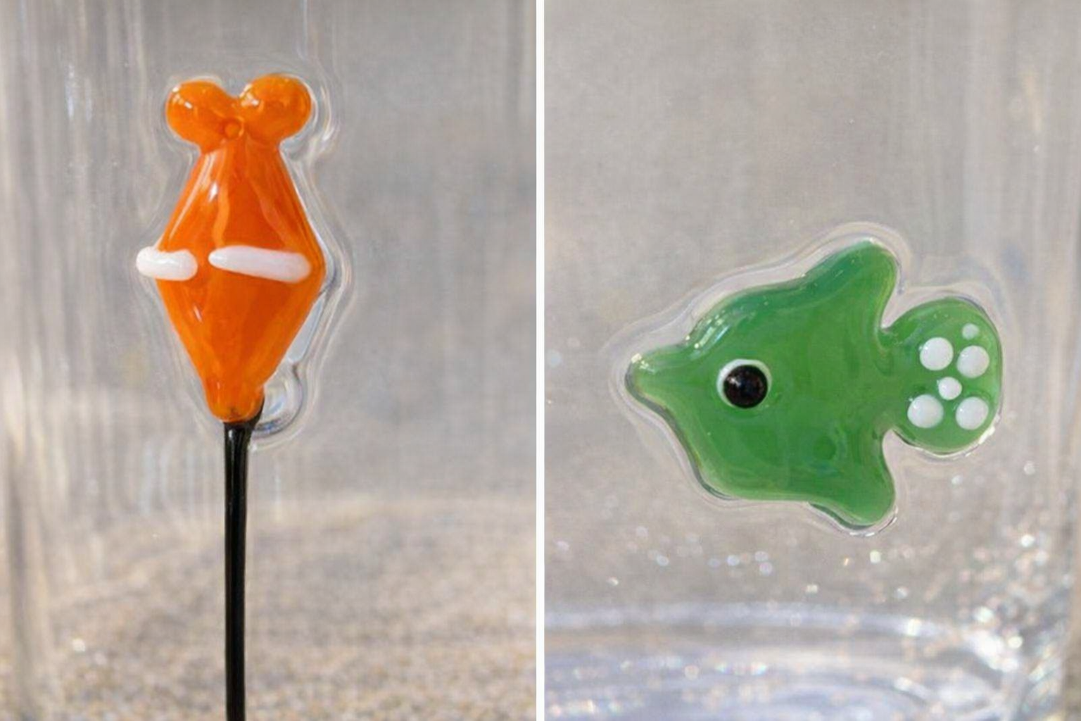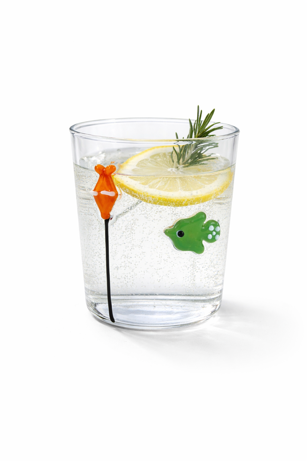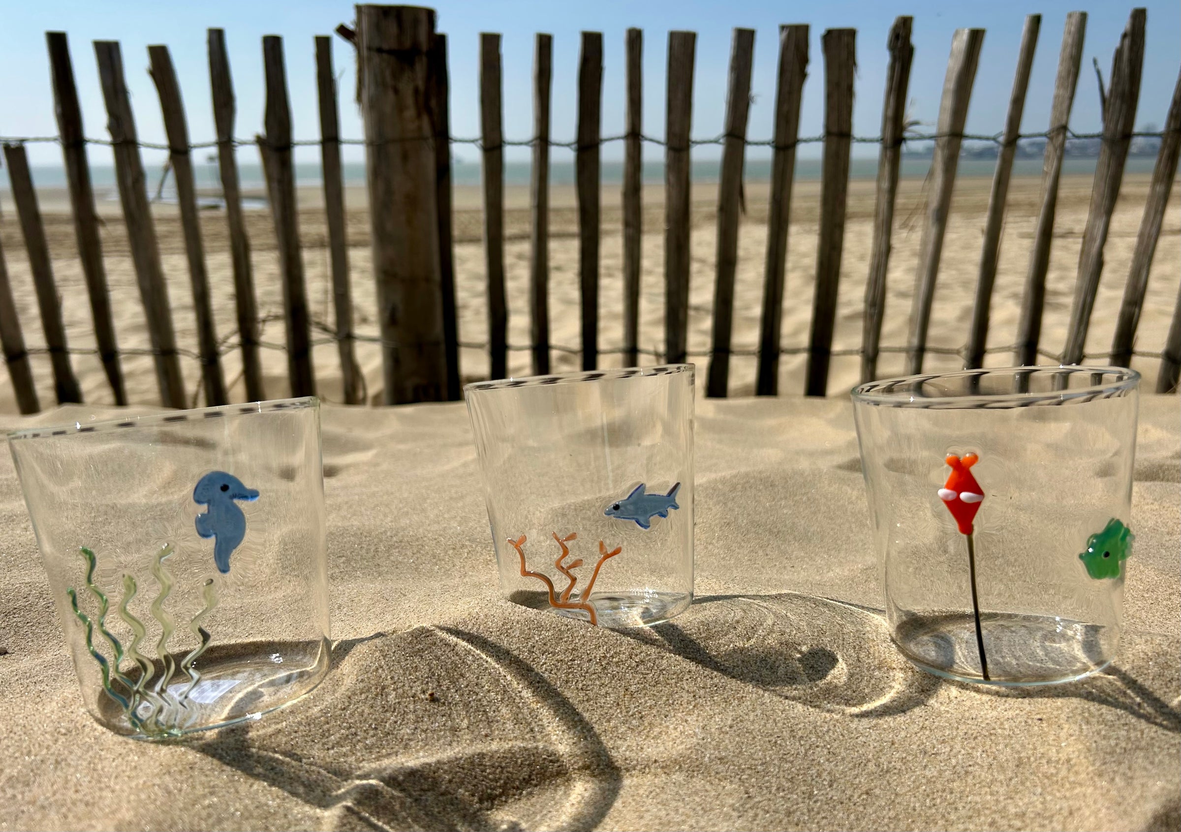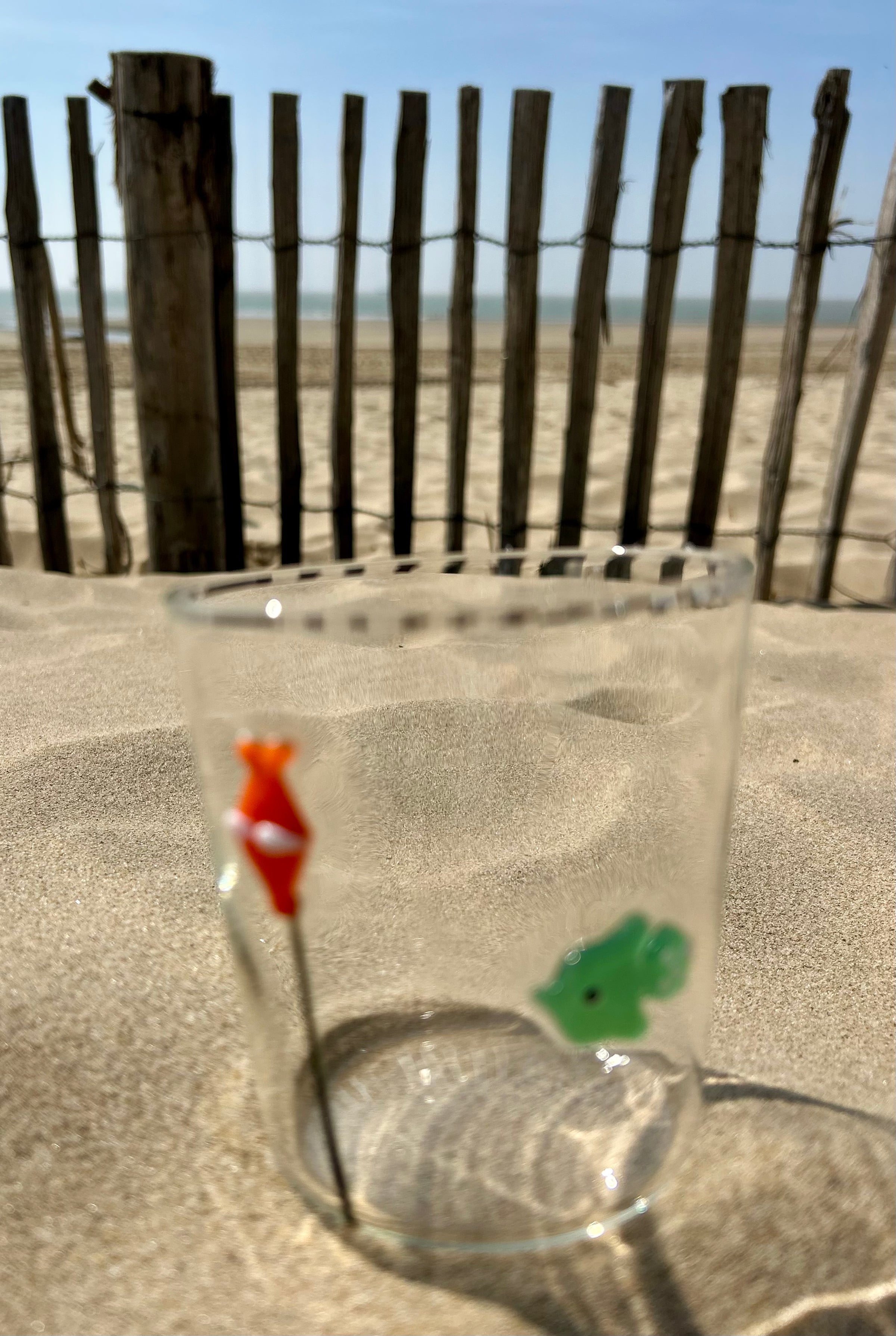 Ce verre transparent au design délicat est sublimé par des éléments décoratifs en verre coloré appliqués à l’extérieur : un petit poisson vert et une bouée rouge. Une pièce unique qui joue sur les détails et la transparence pour créer un effet à la fois léger et sophistiqué.
