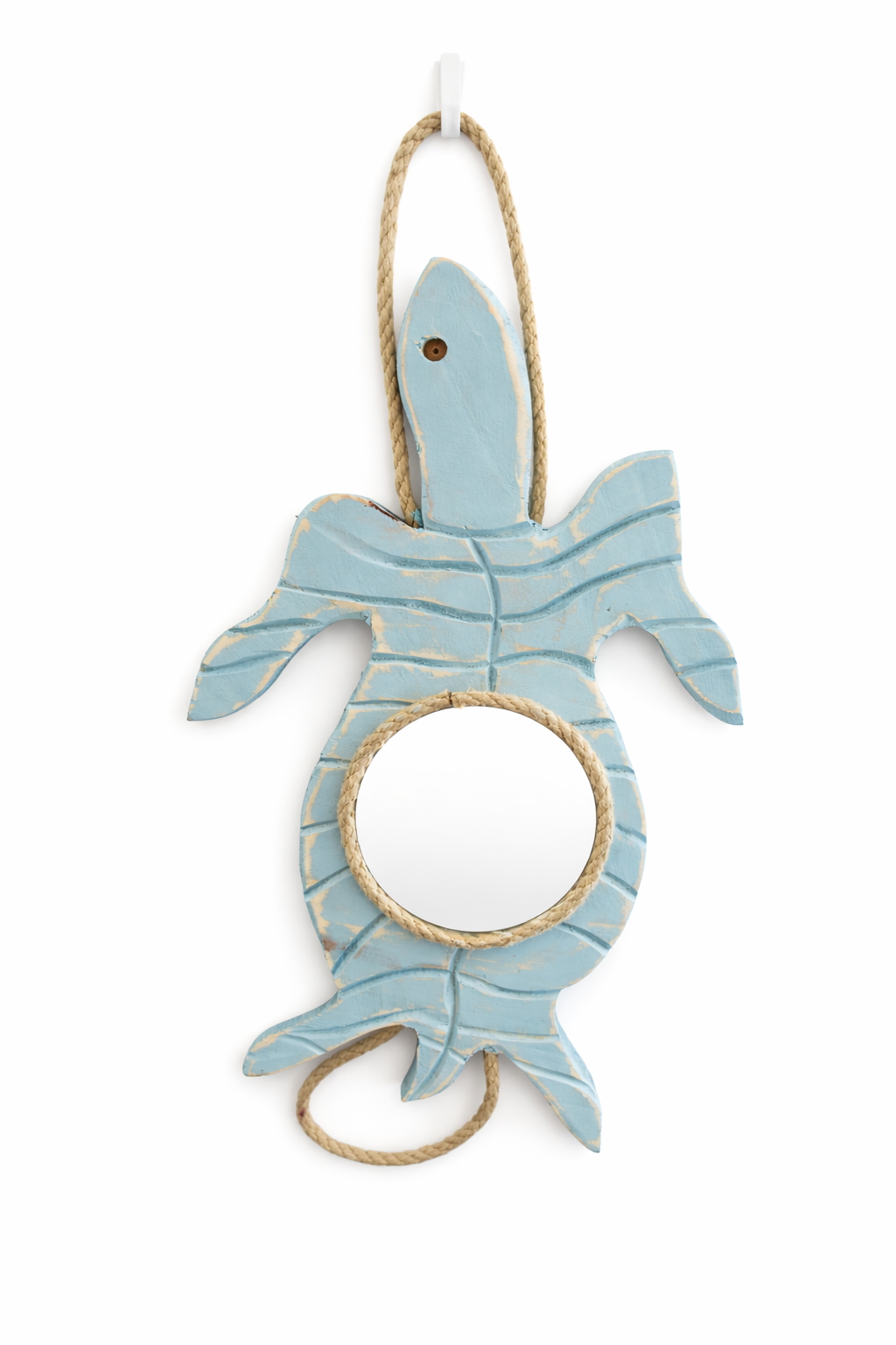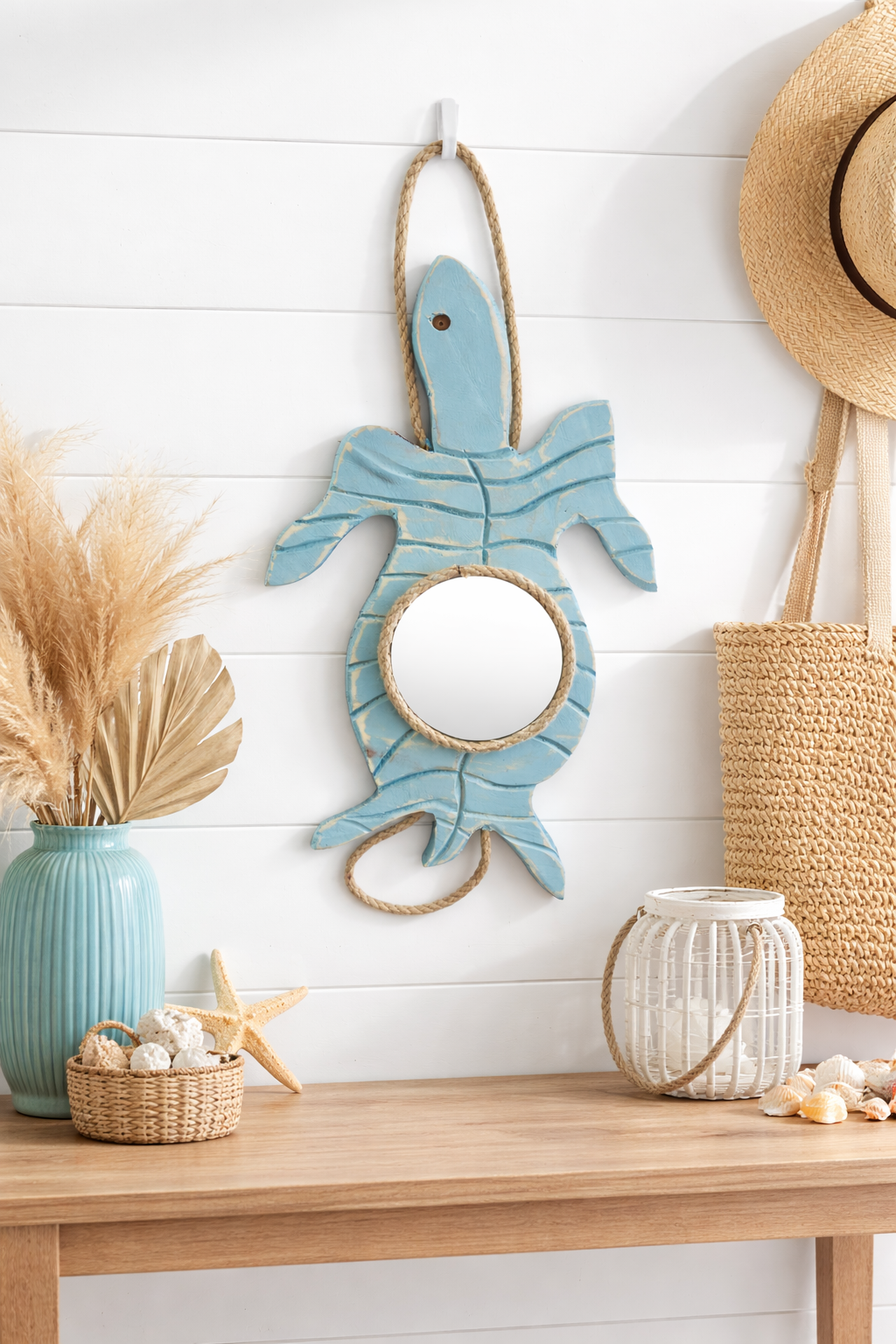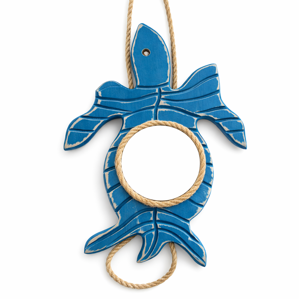 Apportez une touche authentique et originale à votre décoration avec ce miroir mural en forme de tortue, entièrement réalisé à la main. Son style bord de mer et sa finition patinée lui donnent un charme naturel, inspiré des maisons de vacances et de l’univers marin.