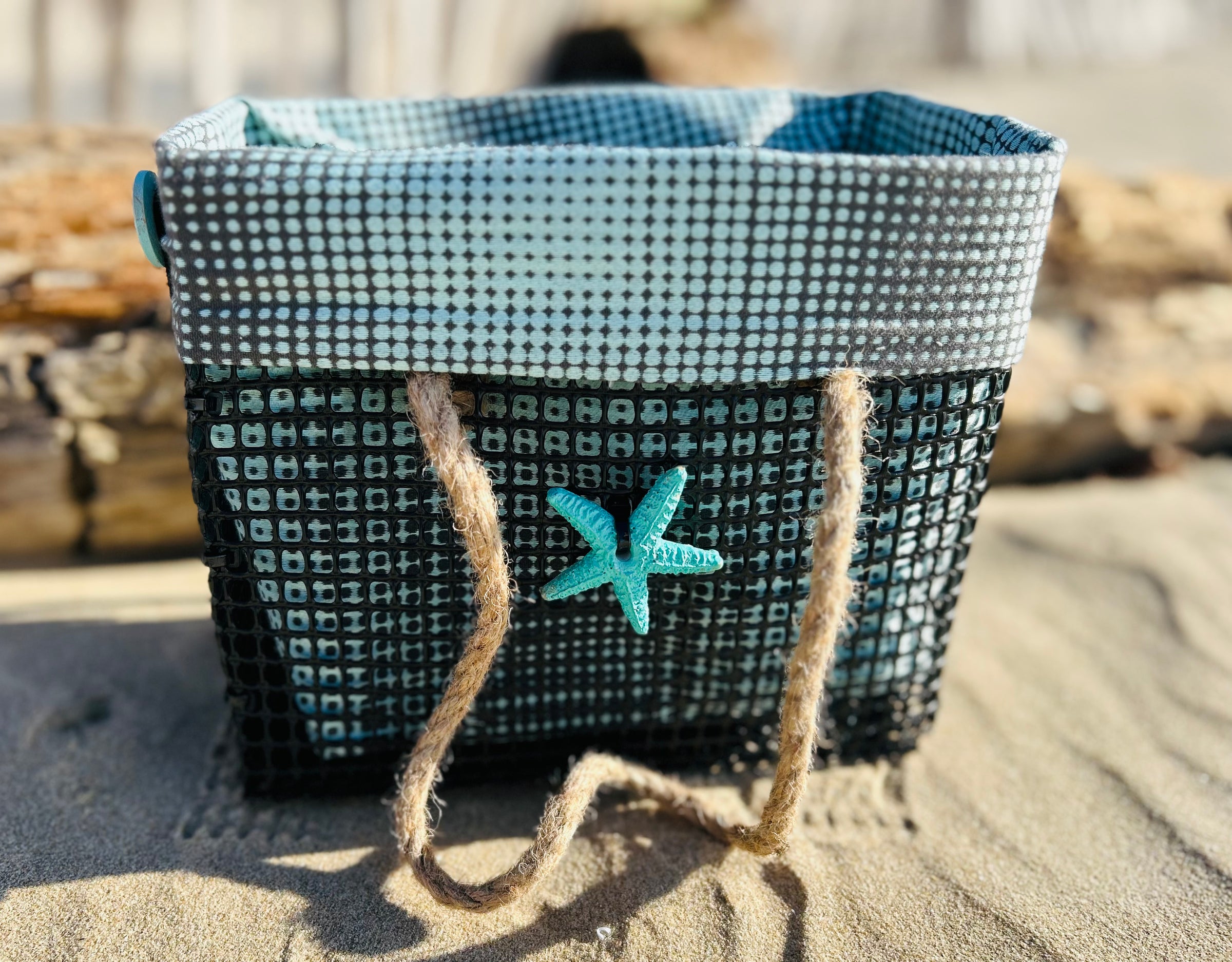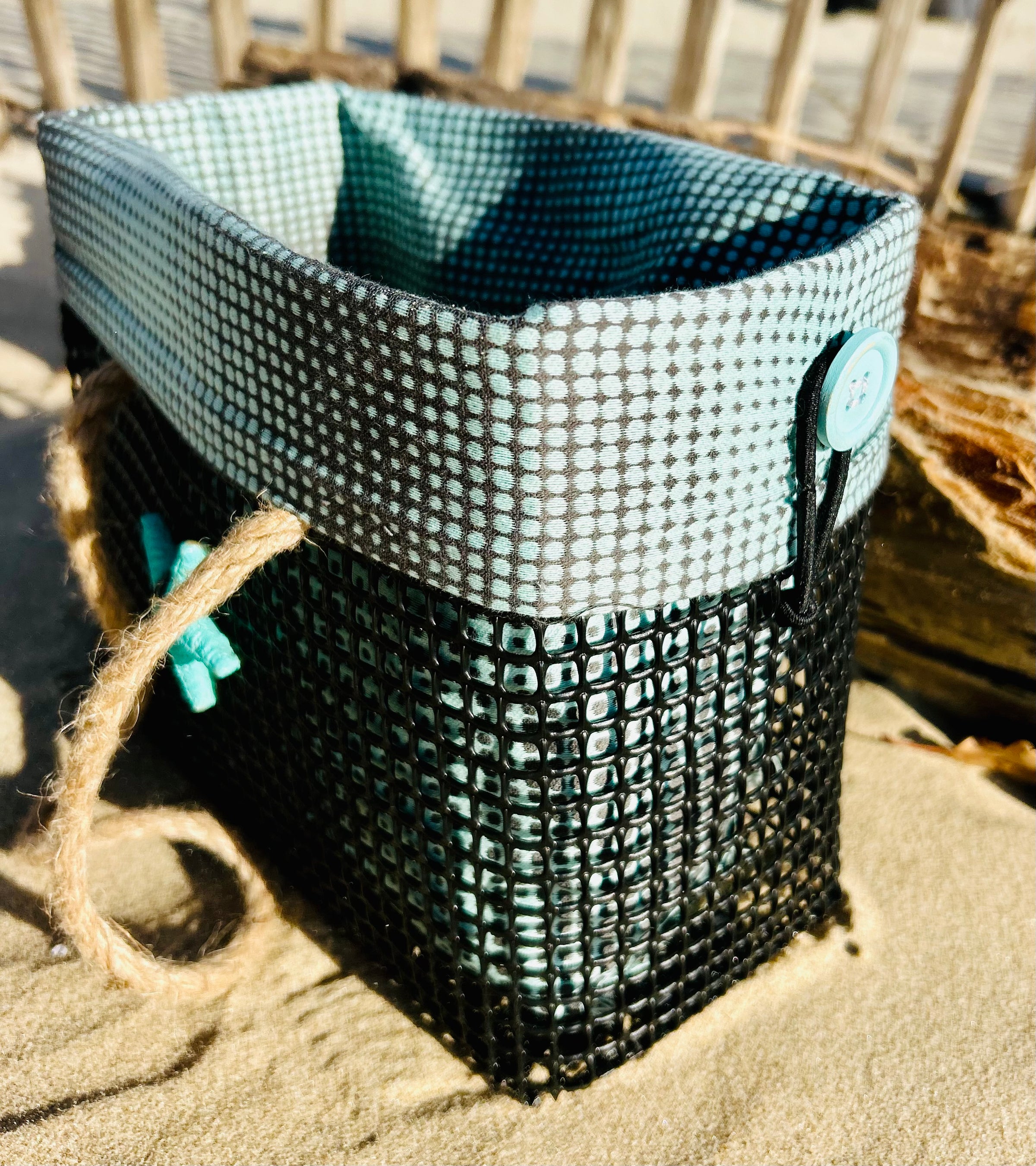 Ce petit panier est réalisé à la main à partir de poche ostréicole, et délicatement habillé d’un tissu coloré à rayures ou motifs marins. Le bouton décoratif n’est pas qu’un détail esthétique : il sert également à maintenir le tissu parfaitement en place.