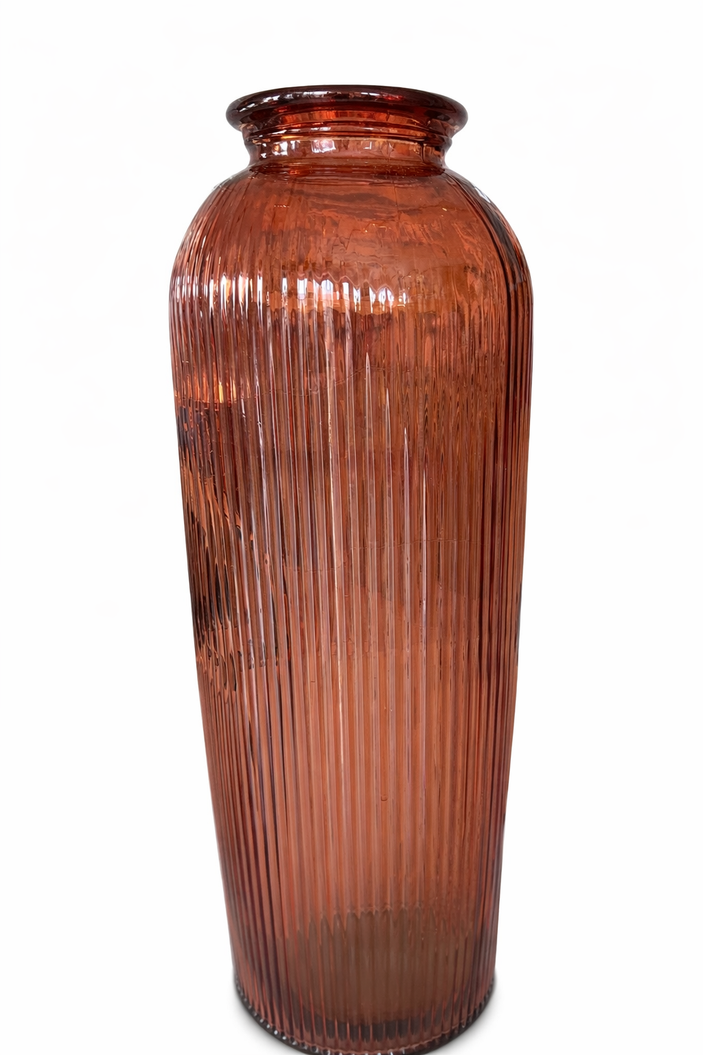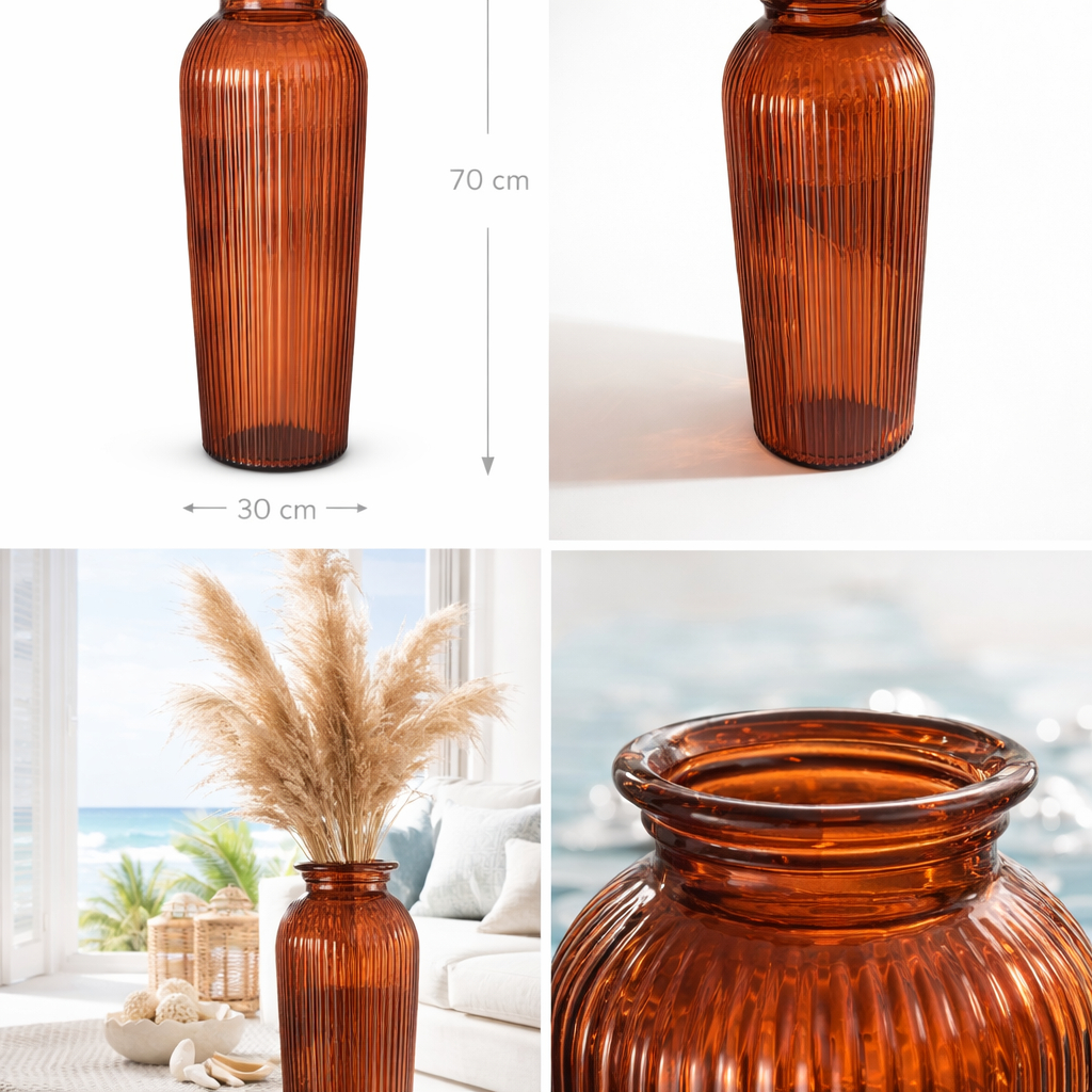 Apportez une touche chaleureuse et élégante à votre décoration avec ce grand vase en verre signé AMADEUS. Sa teinte ambrée lumineuse et ses lignes verticales striées lui donnent un style à la fois contemporain et intemporel.
